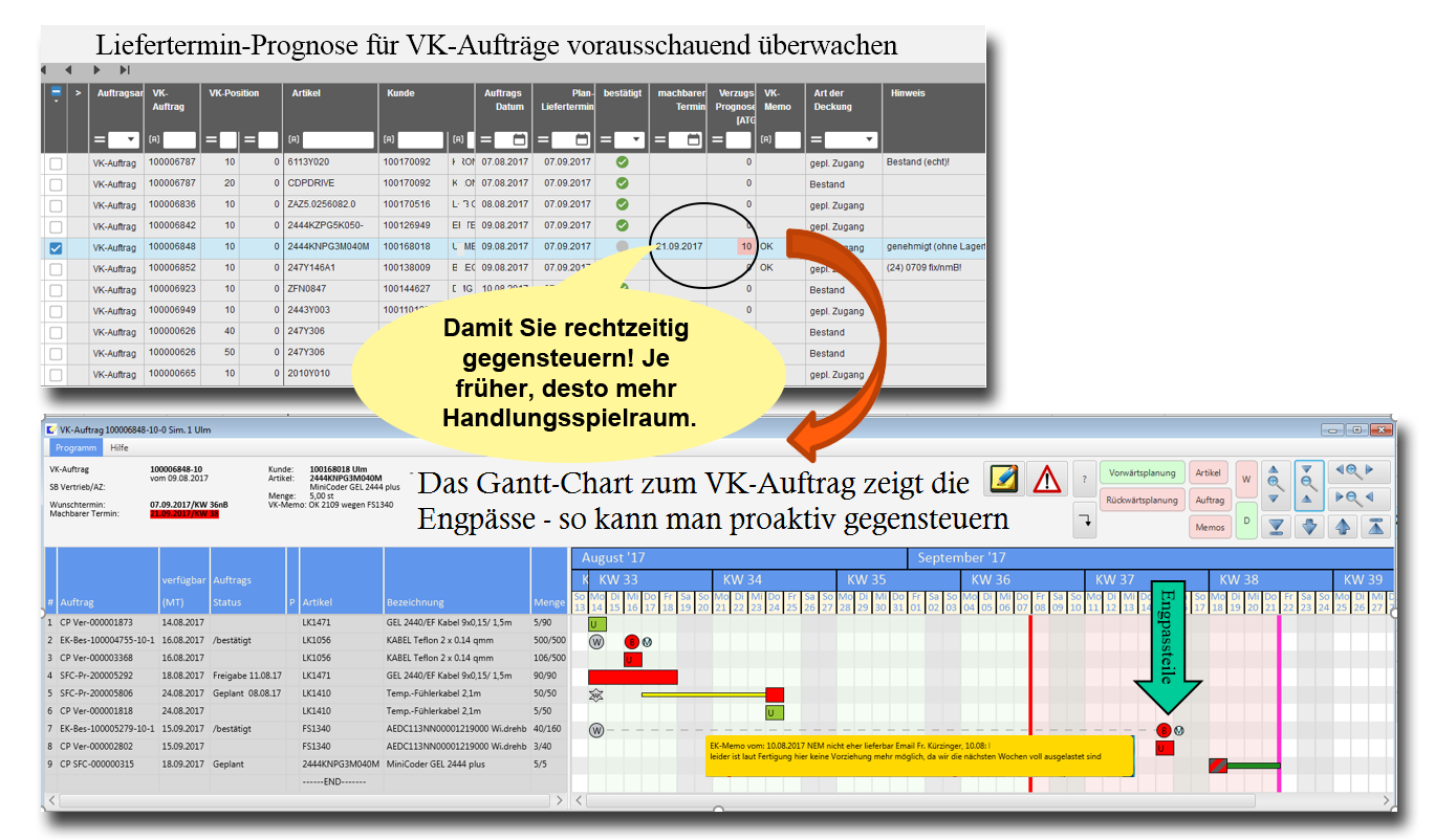 In the sales monitor session the ascon-planner shows all the open, not yet delivered sales items or the sales delivery schedules with their availability status. (inventory, projected receipt,...) It also shows a current default forecast should an item be delayed.