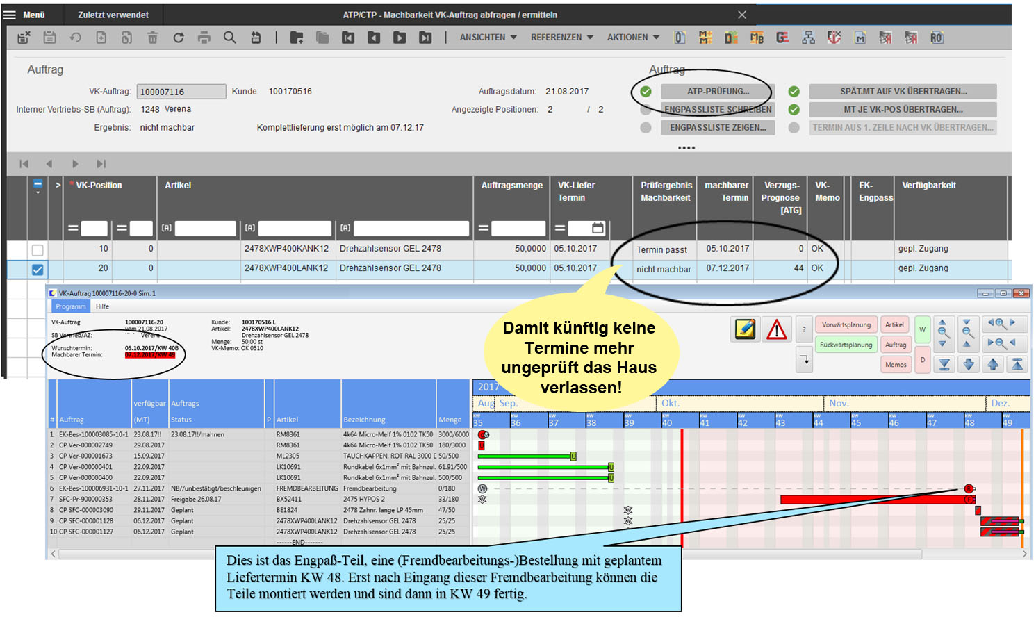 This results in your being shown a feasible date for each sales line, which has been checked on various levels against capacity and material. Even simulated production proposals are generated automatically and orders are rescheduled accordingly.